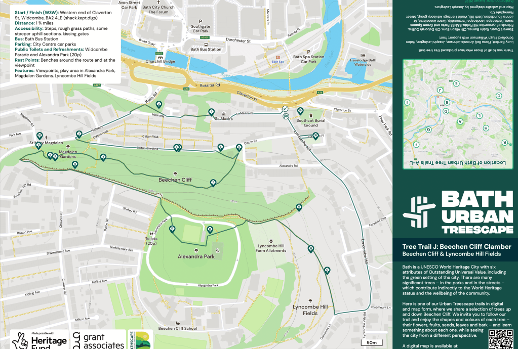 A pdf map of Trail J and a description of the highlighted trees can be found at https://www.bathurbantreescape.com/paper-maps/Bath%20Urban%20Treescape%20-%20Trail%20J%20Beechen%20Cliff%20Clamber%20-%20A3.pdf .