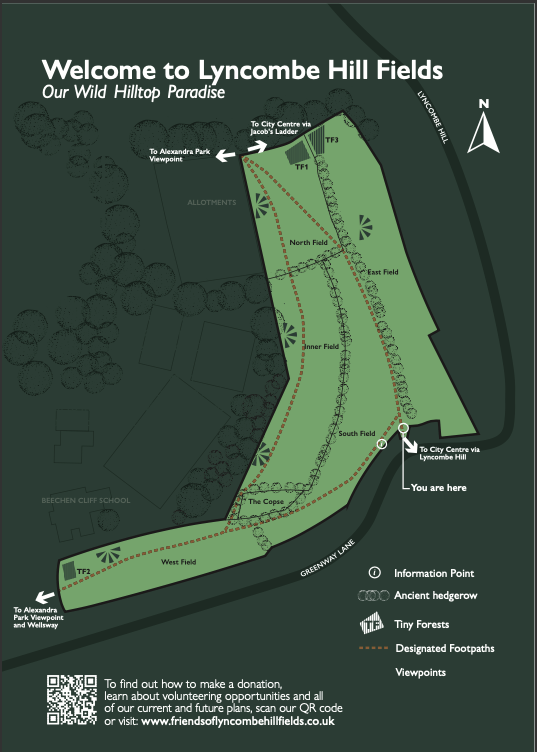 - Erecting maps at the West and North entrance to the fields, an information board in the south field, and information boards for each of the tiny forests.