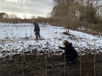 TINY FOREST 3 is located in the NW corner of the East Field. The 450 saplings were planted in January 2023 and comprise 24 species (in descending number order): oak, beech, hornbeam, sliver birch, hawthorn, rowan, hazel, field maple, alder, common buckthorn, bird cherry, downy birch, small leaved lime, wych elm, yew, wild service tree, spindle, osier willow, crab apple, wild cherry, goat willow, grey willow, crack willow and holly.