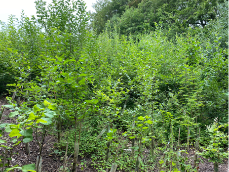 TINY FOREST 1 is located in the NE corner of the North Field. The 580 saplings were planted in January 2021 and comprise 17 species (in descending number order): rowan, goat willow, wild cherry, oak, downy birch, alder, dogwood, silver birch, dog rose, crab apple, hawthorn, hornbeam, beech, grey willow, field maple, bird cherry and hazel.